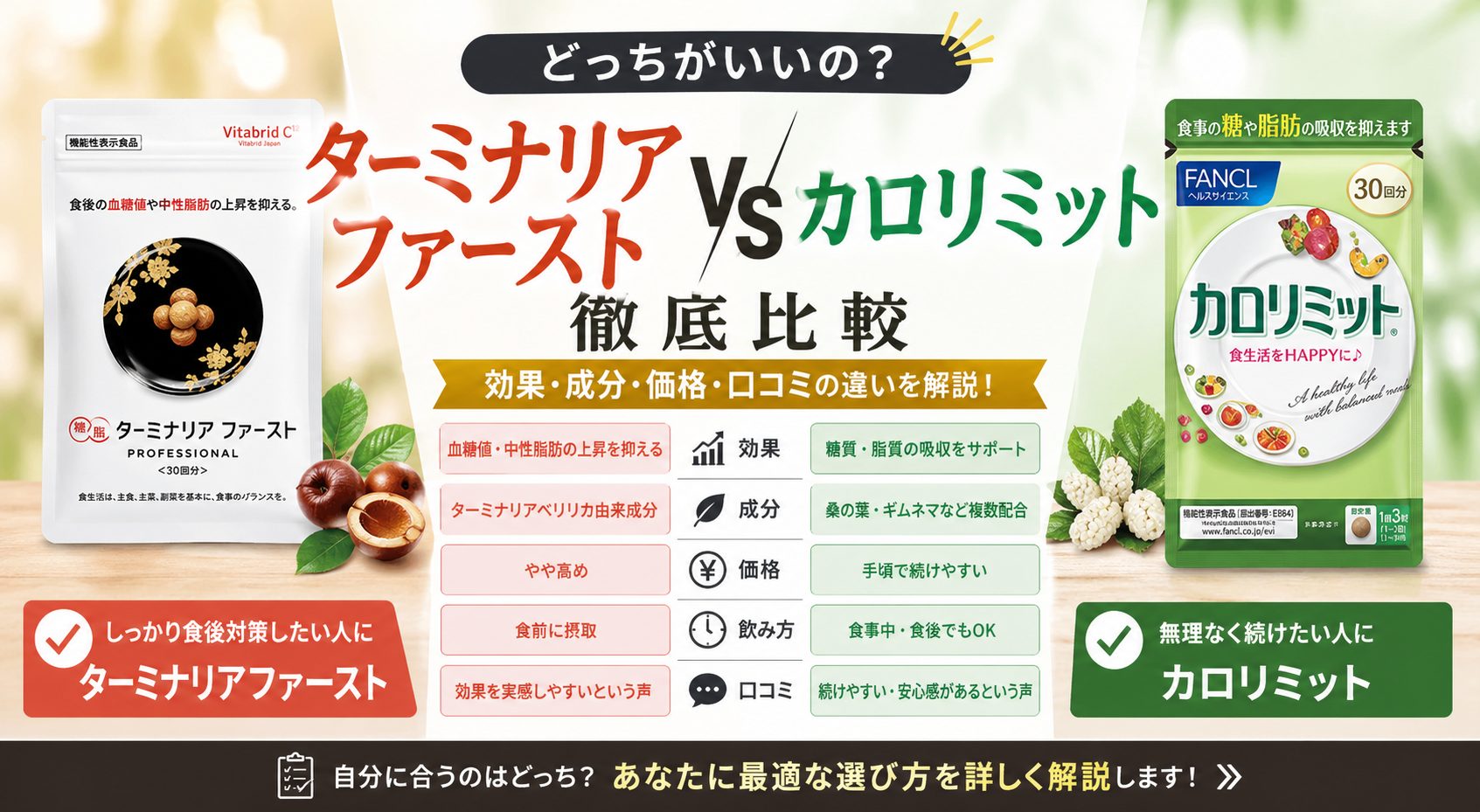 A: 主な違いは「成分」「作用の強さ」「価格」「飲みやすさ」です。ターミナリアファーストは機能性表示食品でピンポイントに作用し、カロリミットは複数成分でバランスよくサポートします。